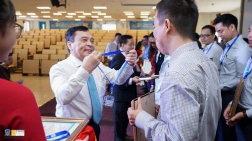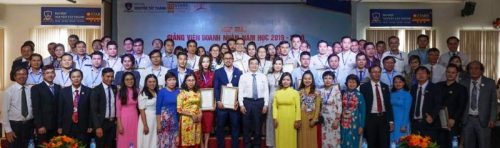 PGS.TS Nguyễn Mạnh Hùng trao thẻ giảng viên doanh nhân Trường ĐH Nguyễn Tất Thành cho một giảng viên Tham dự buổi họp mặt có...