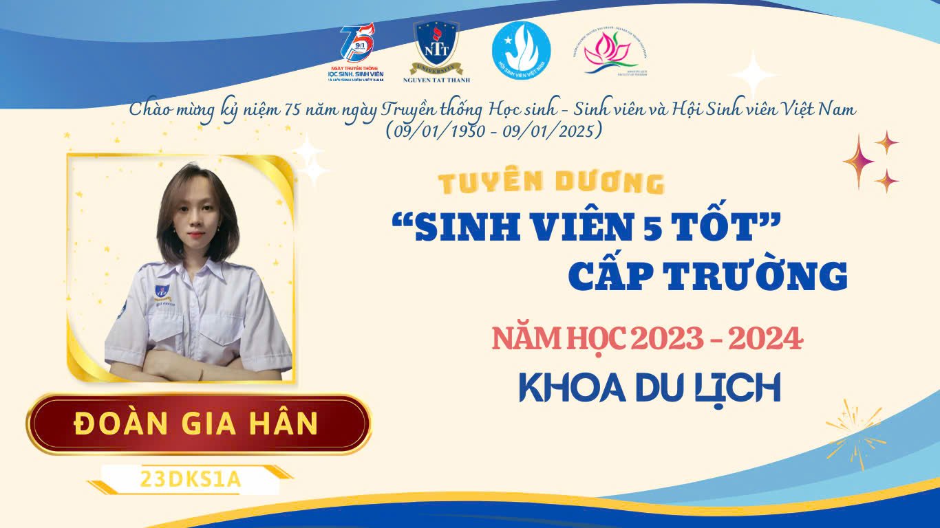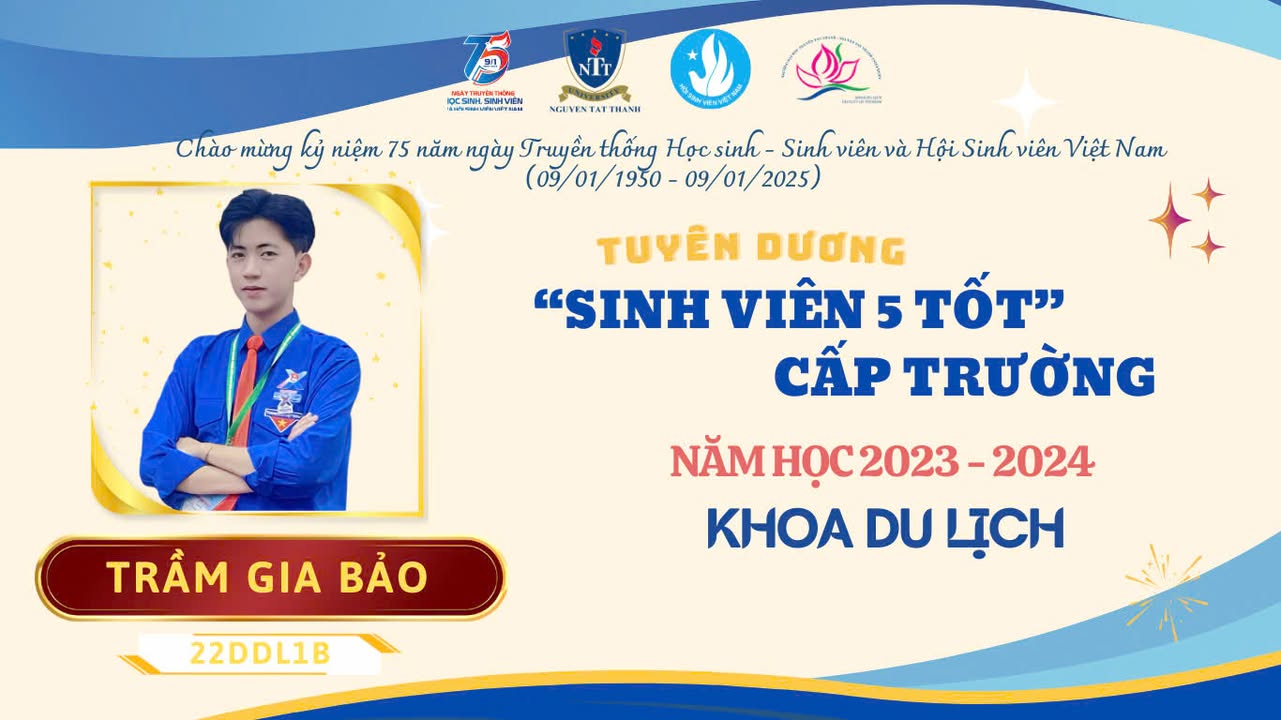 Nhân dịp Kỷ niệm 75 năm Ngày truyền thống Học sinh, Sinh viên và Hội Sinh viên Việt Nam (9/1/1950 – 9/1/2025), Khoa Du lịch vinh dự có hai gương mặt tiêu biểu đạt danh hiệu “Sinh viên 5 tốt” cấp Trường 2023-2024