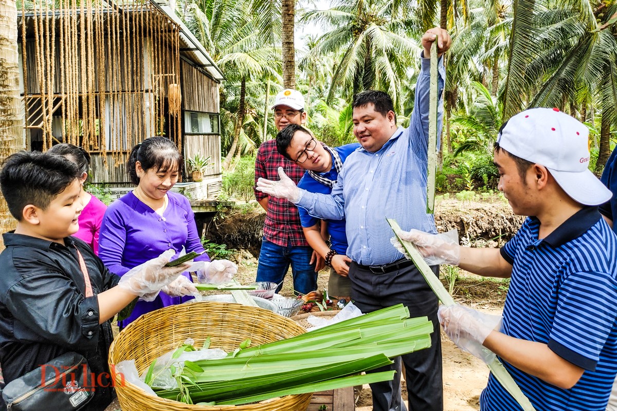 Du khách thích thú trải nghiệm làm bánh lá tại Mocay Farmtay