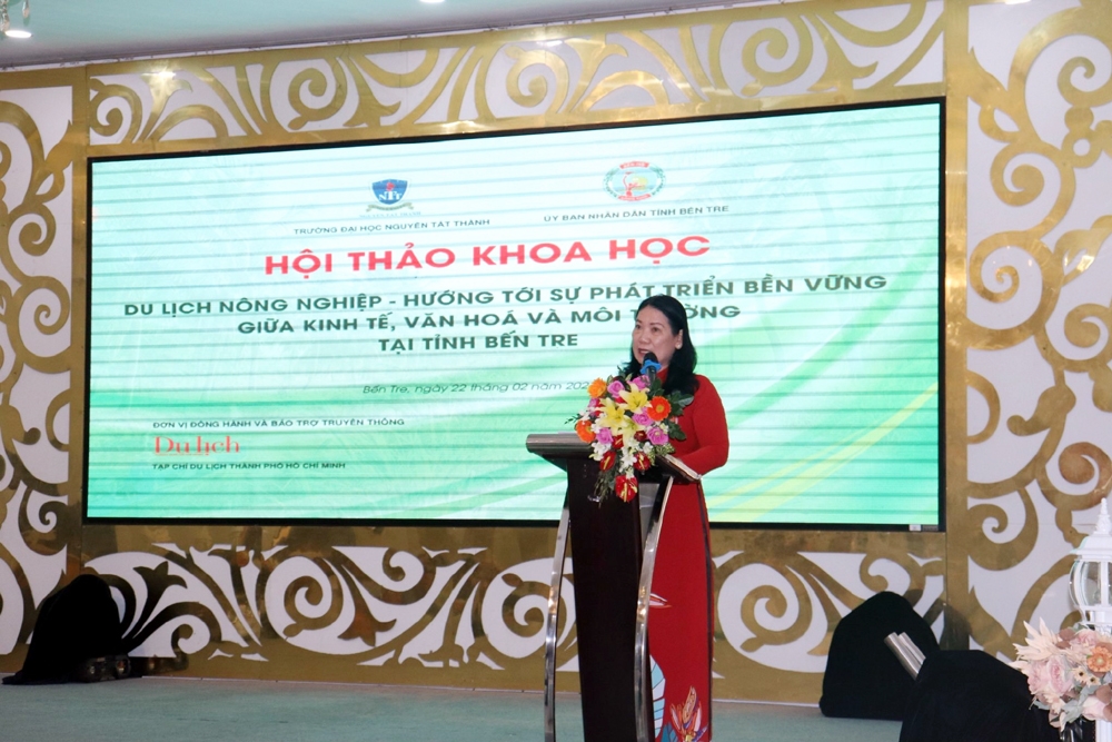 Phát biểu khai mạc Hội thảo, Phó Chủ tịch UBND tỉnh Bến Tre Nguyễn Thị Bé Mười nhấn mạnh: “Với mong muốn ngày càng nâng cao chất lượng, đa dạng hóa sản phẩm, mở rộng mạng lưới và hệ thống du lịch tỉnh Bến Tre nhất là loại hình du lịch nông nghiệp, hướng tới sự phát triển bền vững giữa kinh tế, văn hóa và môi trường trong giai đoạn hiện nay và trong thời gian tới. Trong Hội thảo này, chúng tôi rất mong nhận được nhiều ý kiến tham gia trao đổi, thảo luận từ các chuyên gia, các nhà nghiên cứu, nhà khoa học đến từ các Trường Đại học, các đơn vị kinh doanh du lịch cùng tất cả quý đại biểu đến từ các tỉnh, thành bạn về các vấn đề như: Giải pháp quy hoạch phát triển nông nghiệp; cơ chế chính sách đặc thù, ưu tiên cho loại hình du lịch nông nghiệp; quy hoạch đào tạo, liên kết đào tạo, chuẩn hóa nguồn nhân lực cho mô hình du lịch nông nghiệp; các giải pháp khắc phục tình trạng biến đổi khí hậu, xâm nhập mặn, đảm bảo hoạt động sản xuất nông nghiệp; sự liên kết chặt chẽ giữa các bên trong mô hình phát triển du lịch nông nghiệp; công tác truyền thông, quảng bá các sản phẩm du lịch nông nghiệp trên nhiều phương tiện thông tin đại chúng… Các ý kiến tham luận và các ý kiến phát biểu trao đổi, thảo luận, góp ý của quý đại biểu tại hội thảo này chúng tôi sẽ ghi nhận, tiếp thu nghiên cứu để làm cơ sở vận dụng trong quá trình quản lý, xây dựng các chương trình, đề án, kế hoạch phát triển du lịch của tỉnh, của từng địa phương và từng đơn vị kinh doanh du lịch trong thời gian tới nhằm góp phần đưa du lịch tỉnh Bến Tre nói riêng, du lịch khu vực Đồng bằng sông Cửu Long và cả nước ngày càng phát triển bền vững”.
