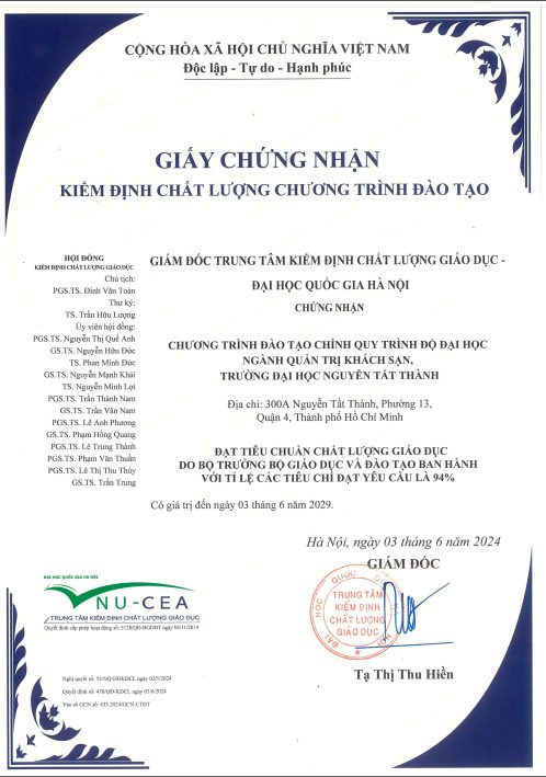Khoa Du lịch, trong bối cảnh này, đã có nhiều đóng góp quan trọng. Cụ thể, trong dịp kỷ niệm 25 năm thành lập và phát triển của Trường Đại học Nguyễn Tất Thành, Khoa Du lịch đã vinh dự nhận Chứng nhận kiểm định chất lượng chương trình đào tạo ngành Quản trị Khách sạn từ Trung tâm Kiểm định chất lượng giáo dục Đại học Quốc gia Hà Nội. Ngoài ra, ngành Quản trị Khách sạn còn nhận được chứng nhận gắn sao UPM từ NGND. GS.TS. Nguyễn Hữu Đức. Điều này thể hiện rõ sự vươn lên và tự hào của Khoa Du lịch cũng như của Trường Đại học Nguyễn Tất Thành trước các chuẩn kiểm định và tái kiểm định chất lượng.