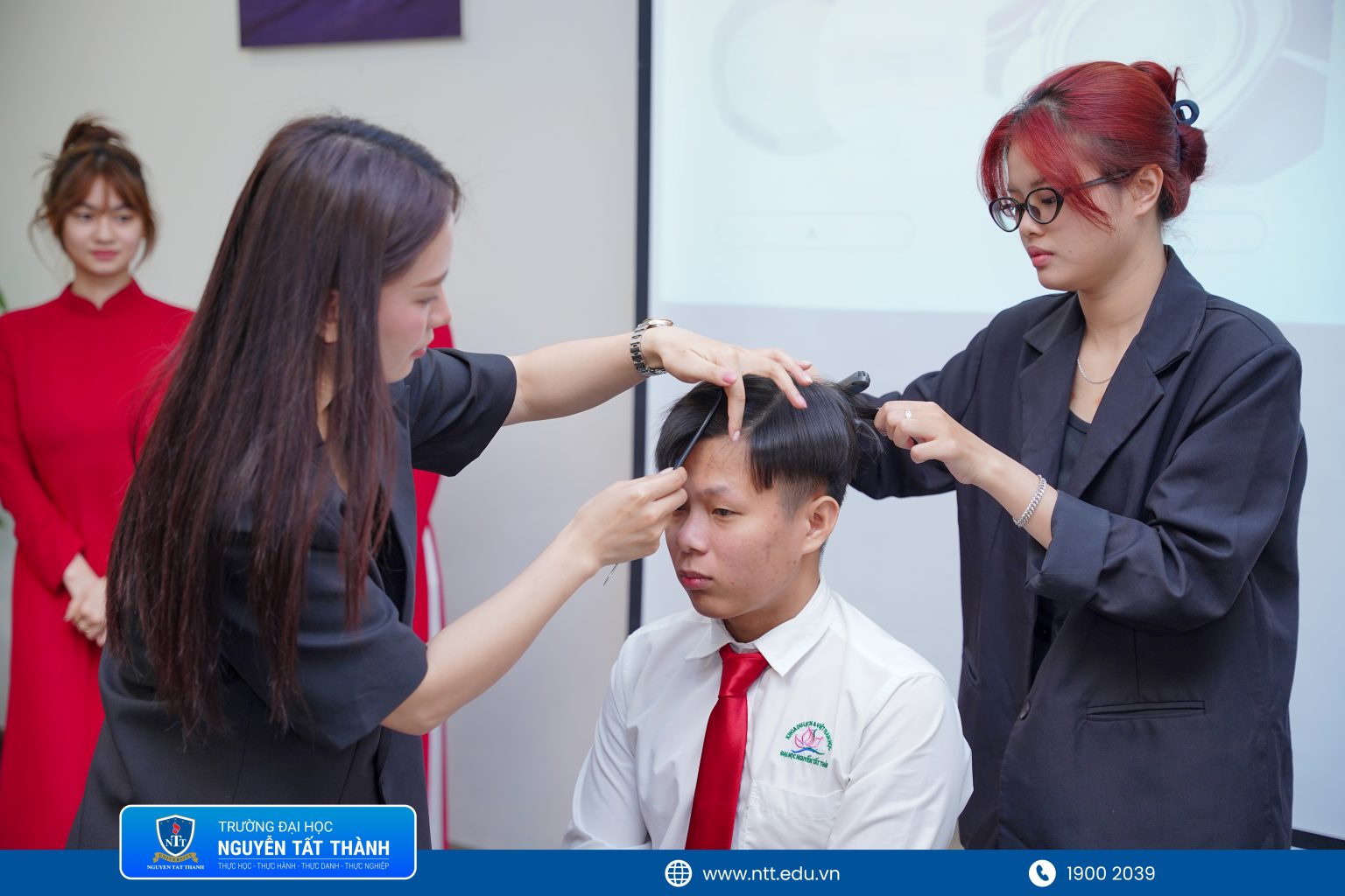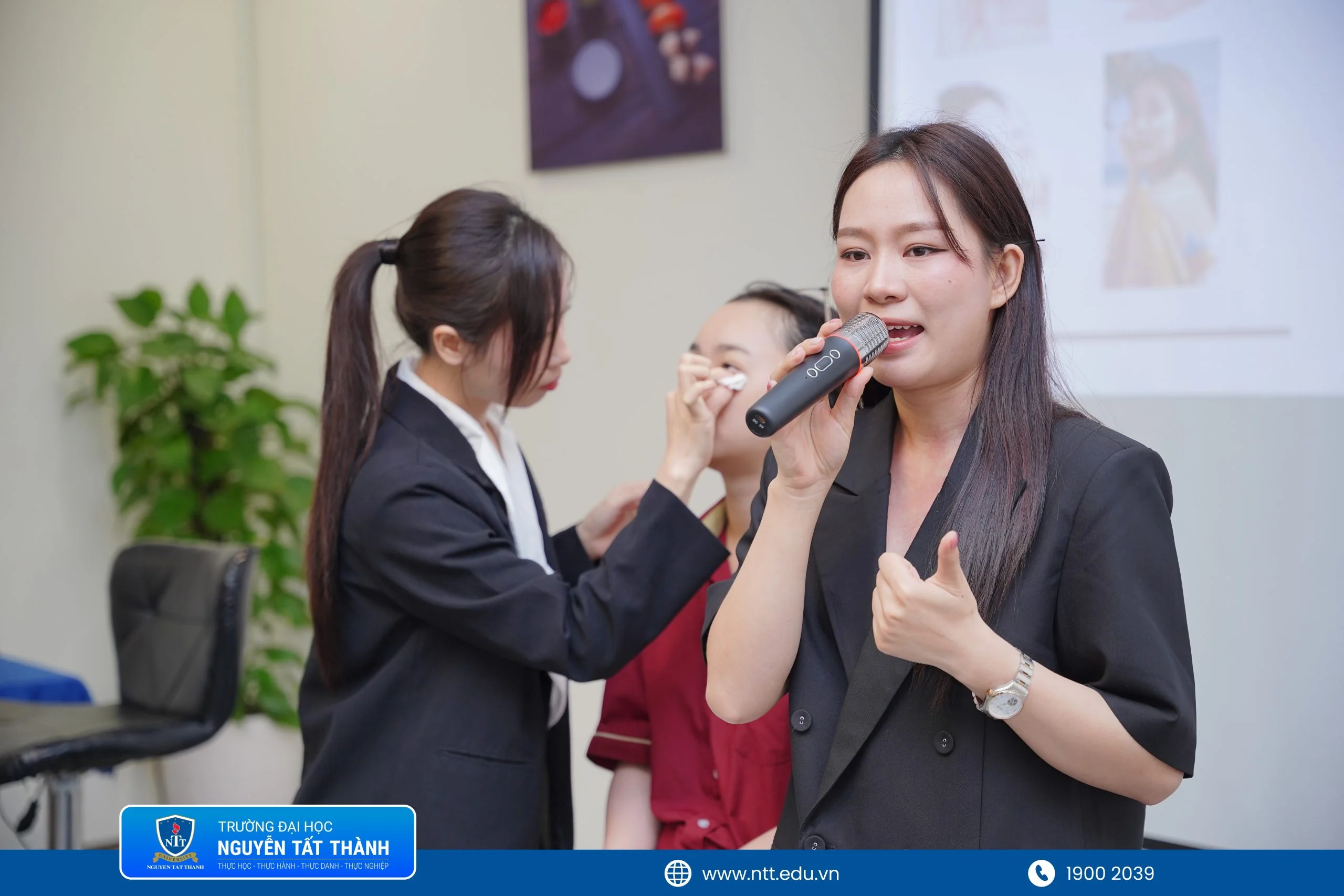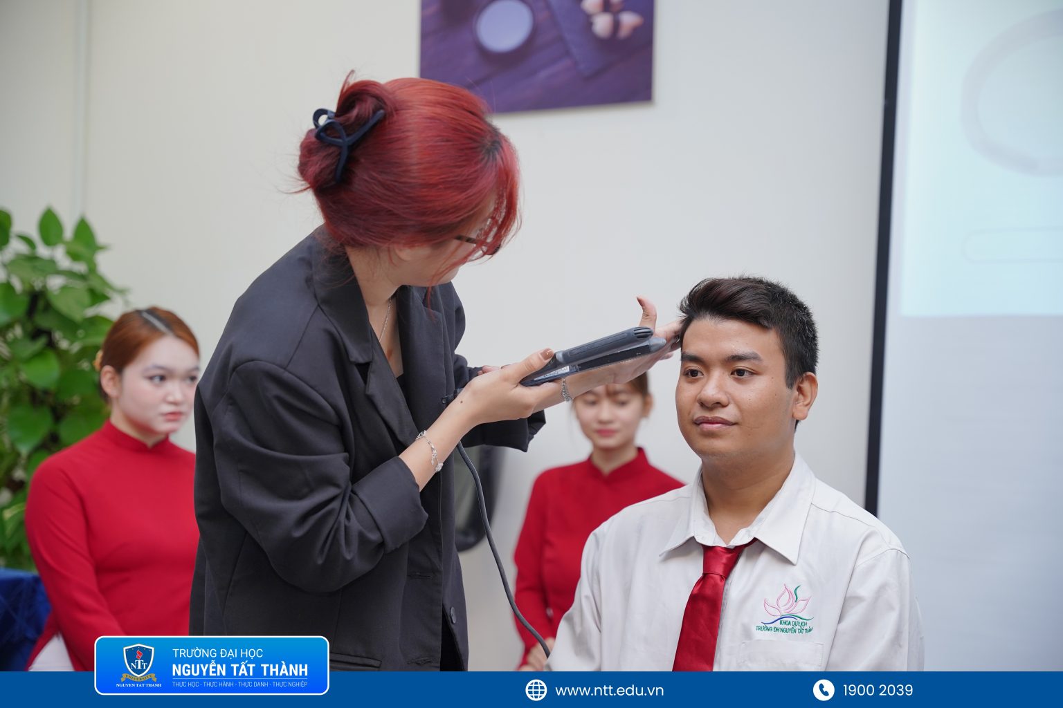 Tại chuyên đề “Nghệ thuật trang điểm chuyên nghiệp trong ngành dịch vụ”, chuyên gia trang điểm Tâm Phạm chia sẻ và hướng dẫn trực tiếp. Tại đây, sinh viên được tiếp cận kiến thức về vai trò của diện mạo trong môi trường khách sạn, quy trình trang điểm cơ bản cũng như các kỹ thuật tạo kiểu tóc phù hợp với từng vị trí công việc cho cả nam và nữ. Thông qua các hoạt động thực hành, sinh viên được tự tay trải nghiệm và hoàn thiện kỹ năng dưới sự hướng dẫn của chuyên gia. Qua trải nghiệm này, nhiều bạn đã tích lũy thêm kinh nghiệm để chủ động xây dựng hình ảnh cá nhân chỉn chu, phù hợp với đặc thù nghề nghiệp.