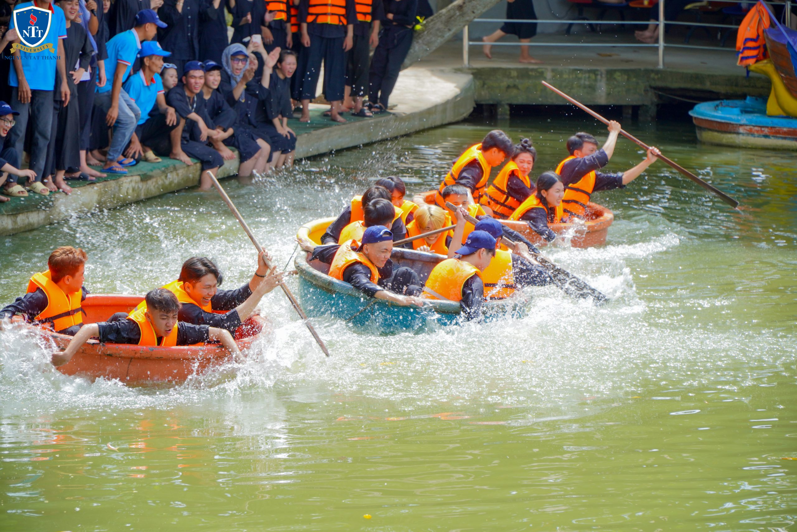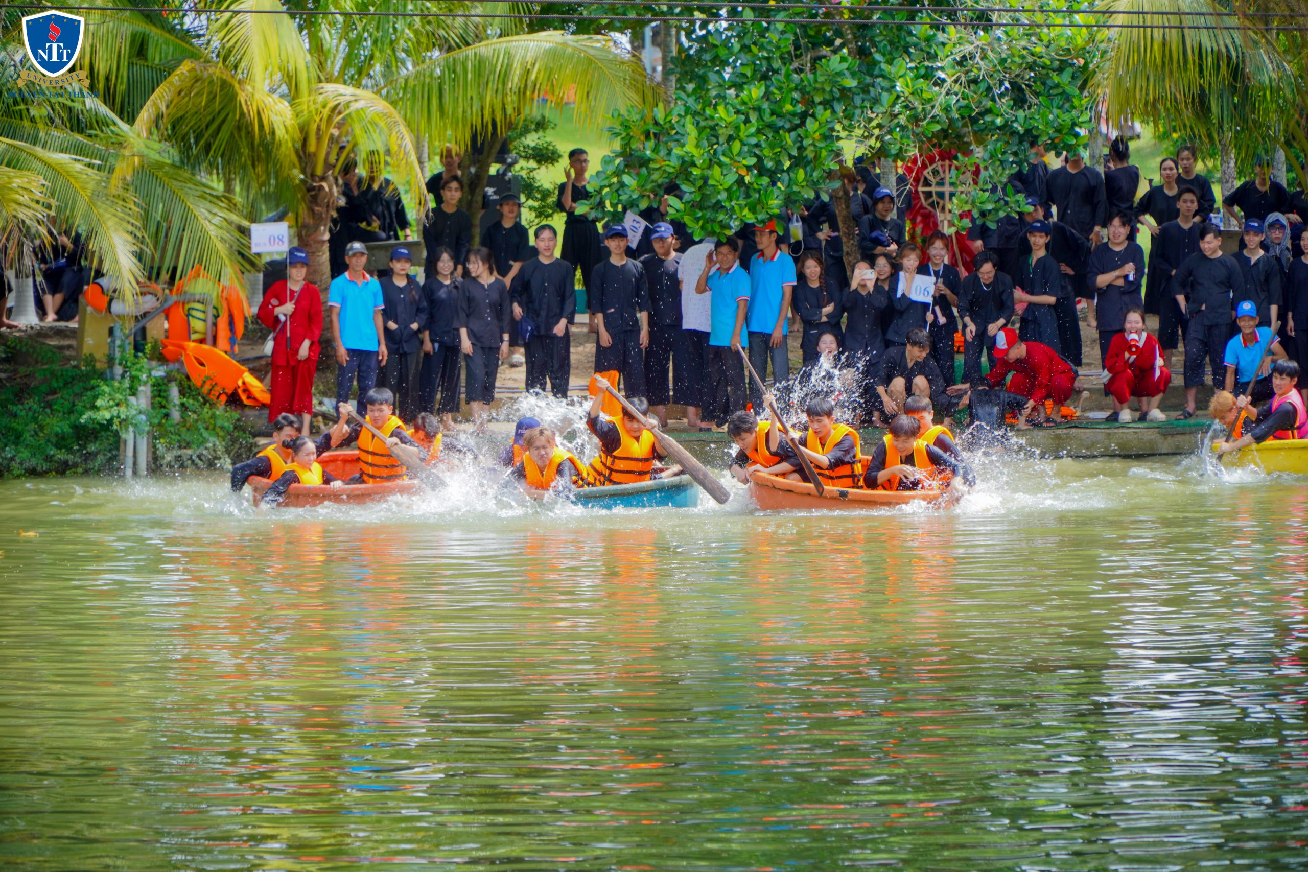 Nếu có trò chơi nào mang lại tiếng cười rộn rã nhất tại hội trại, thì đó chính là chèo thúng bắt vịt. Các bạn sinh viên, trong bộ bà ba đậm chất miền Tây, bước vào thử thách đầy cam go: chèo thúng giữa ao nước để bắt những chú vịt siêu lanh lợi.