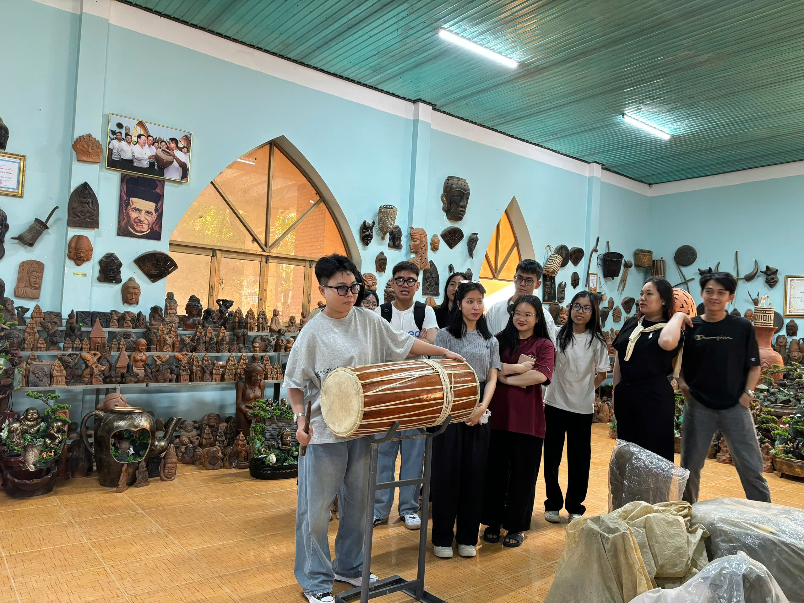 Văn hóa đại ngàn là linh hồn của Tây Nguyên, nơi lưu giữ những giá trị truyền thống lâu đời. Trong hành trình, sinh viên Việt Nam học đã được sống trong không gian đậm đà bản sắc tại khu bảo tồn văn hóa dân tộc S’Tiêng Sóc Bom Bo ở Bình Phước. Tại đây, âm thanh tiếng chày giã gạo, hình ảnh bộ cồng chiêng kỷ lục và nghề dệt thổ cẩm không chỉ tái hiện cuộc sống xưa cũ mà còn gợi nhớ tinh thần kiên cường của người dân vùng cao. Đặc biệt, đoàn cũng ghé thăm Nhà trưng bày văn hóa người Mạ (Đắk Nông), nơi lưu giữ những hiện vật quý giá, từ nhạc cụ, công cụ lao động đến trang phục truyền thống. Không gian nơi đây giúp sinh viên hiểu sâu hơn về đời sống, tín ngưỡng và tinh thần sáng tạo của người Mạ, một dân tộc giàu bản sắc tại Tây Nguyên.