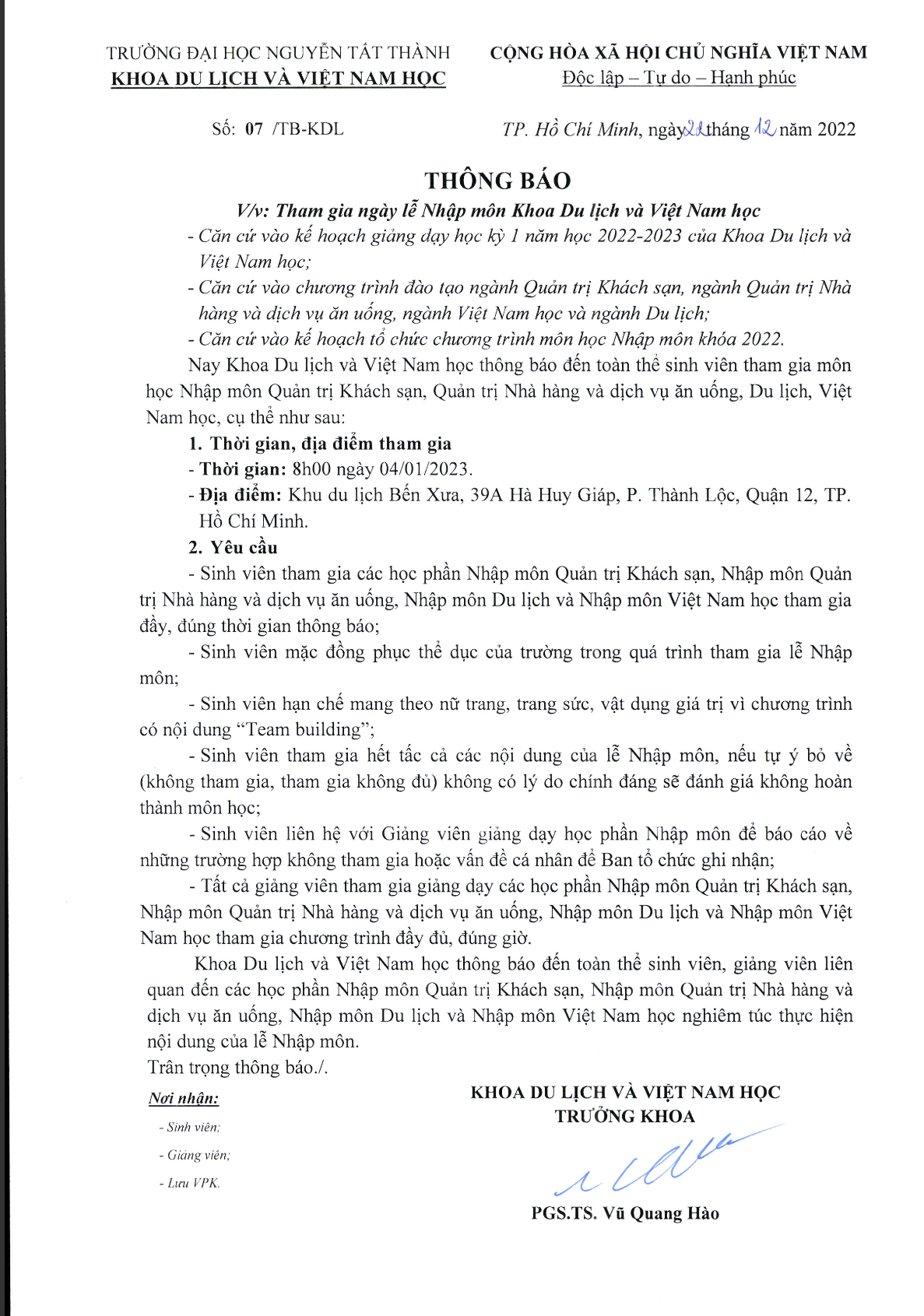 Thông báo v/v tham gia ngày lễ Nhập môn Khoa DL&VNH