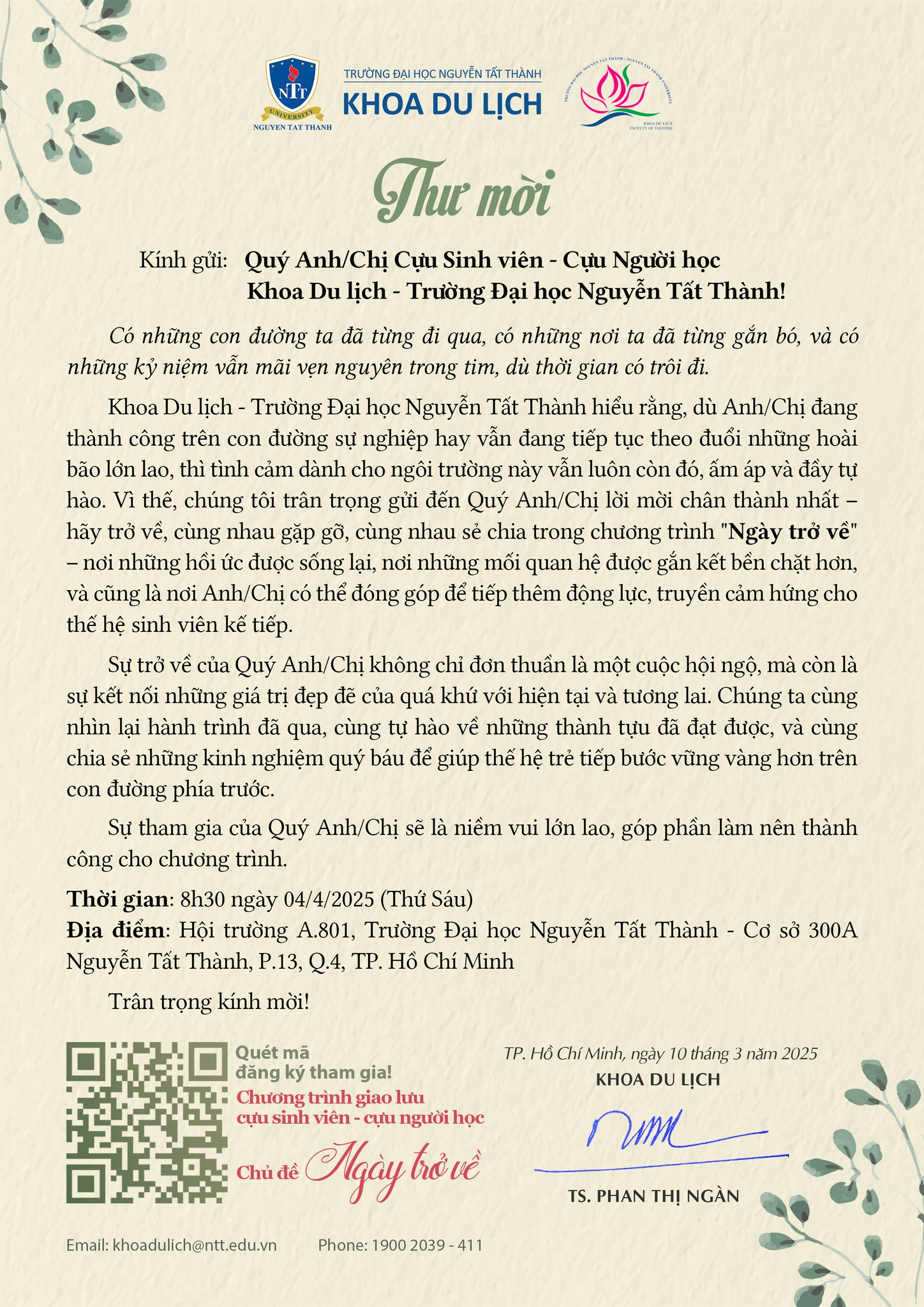/ THƯ MỜI HỌP MẶT “NGÀY TRỞ VỀ” CỰU SINH VIÊN, CỰU NGƯỜI HỌC KHOA DU LỊCH