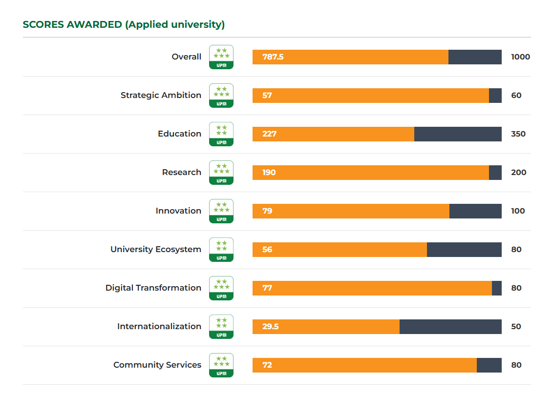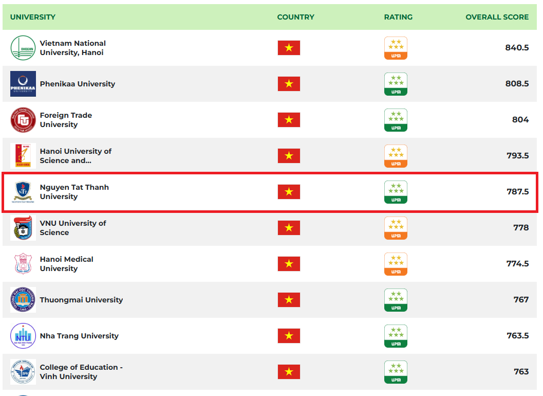 Theo kết quả từ UPM, năm 2025, có 14 cơ sở giáo dục đại học được gắn 5 sao, trong đó có 9 trường đạt 5 sao theo định hướng ứng dụng, 5 trường theo định hướng nghiên cứu. Năm nay, Trường ĐH Nguyễn Tất Thành có bước tiến đáng kể trên bảng xếp hạng khi tổng điểm đạt 787.5/1000, tăng 35.5 điểm so với năm 2022 (752 điểm), nằm trong tốp 5 trường đại học tại Việt Nam.